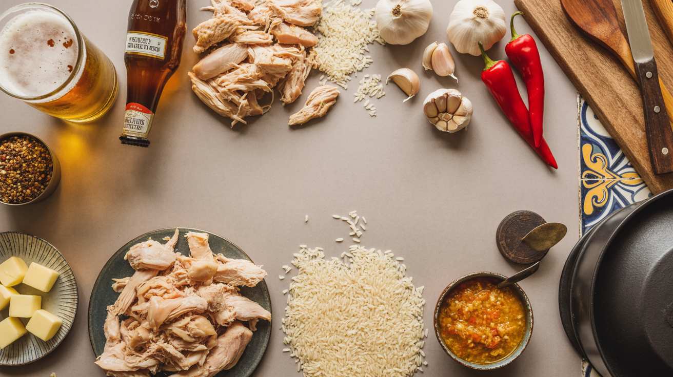 Tender chicken slow-cooked in the beloved Mozambique sauce — a rich, buttery broth of garlic, beer, hot sauce, and spices beloved across the Northeast. Deep golden color, complex layered flavor, and a satisfying kick served over fluffy rice.
